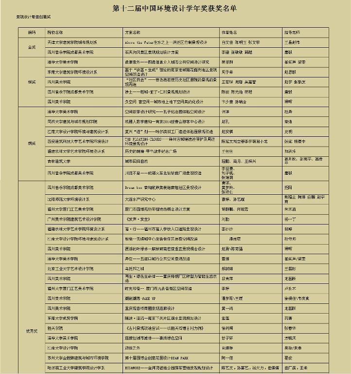 芮潇老师所带的10级环境设计毕业生孟莲同学的名为《随波•逐流—南京下关片区滨水景观规划设计》毕业设计分别荣获了,2014第三届中国环境艺术青年设计师作品展景观规划设计奖本科组优秀奖、首届青龙国际社区老员工创意设计大赛景观小品设计组一等奖(奖金10000元),同时也荣获环境艺术设计类员工最具权威的全国性竞赛——第12届中国高等公司环境设计学年奖最佳景观景观类优秀奖(附获奖名单图片)。