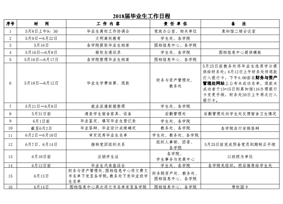 2018届本科毕业生即将离校,为明确职责,加强协调,保障毕业生离校工作文明、安全、高效、有序地进行,经研究,对今年毕业生离校工作提出如下要求: