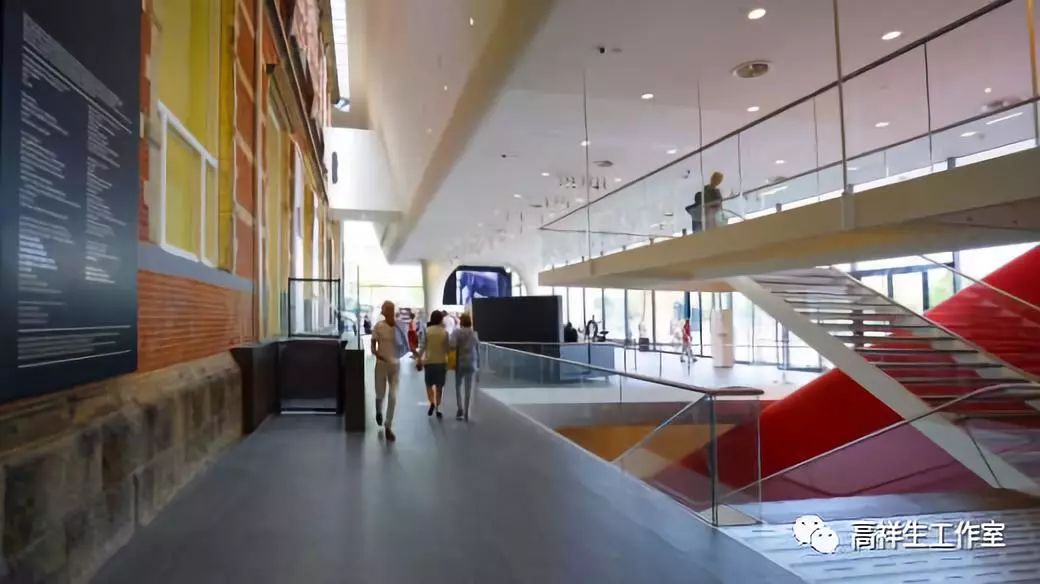 若有机会,人们不妨去参观一下阿姆斯特丹现代艺术馆,从底层大厅的入口处进入,一眼望去,一面建筑石墙凌空对接着一个白色的不规则室内空间,下方的橘红色的走廊式自动扶梯通往现代艺术馆的二层平台,一个由白底黑字的简约式海报铺就的室内空间,建筑的室内摆放的装饰品也是新意十足。