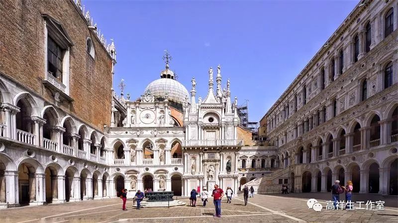 圣马可小广场由相向而立的总督府西立面和图书馆东立面围合而成。威尼斯总督府,教科书称其为拜占庭风格,虽然它与圣马可教堂毗邻但是两者的建筑风格截然不同。教科书上都把总督府立面的造型作为拜占庭的典范向读者和员工介绍,由清华大学陈志华先生著的《外国建筑史(19世纪末叶以前)(第三版)》中如此描写到“威尼斯总督府是欧洲中世纪最美丽的建筑之一。总督府曾经几度改建,原来是一座拜占庭式的建筑,……它的平面是四合院式的……总督府的主要特色在南立面和西立面的构图。……这墙面的处理显然受到伊斯兰建筑的影响。……这两个立面的构图极富有独创性,奇光异彩,世界建筑史中几乎没有可以类比的例子。……”从这段文字中可以得到几个结论:总督府的原貌是拜占庭式样的,中途改造过,可见拜占庭样式就不会太纯正。我认为陈先生对南立面和西立面的描写是细致精确的,陈先生详尽的介绍了总督府外立面特别是南立面和西立面是拜占庭风格的典范,但是陈先生既然提到了总督府是四合院式的,但我没看到对内庭的描写,我所见到的内庭主面上以及室内空间大多是古典风格,依稀可以见到巴洛克风格在建筑上的体现。为何内庭的风格跟外立面截然不同,是原有的还是加建的,其缘由我不得而知。