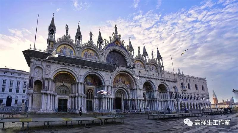 拿破仑说过“圣马可广场是欧洲最美的客厅。”广场一端的圣马可教堂披红戴绿,金光闪闪。在佛晓霞光的衬托下圣马可教堂的形态动人;而阳光照耀下的圣马可教堂更为妩媚,盘旋的海燕使教堂的室外空间更加生动;夜幕下的圣马可教堂和环境都已笼罩在深蓝色的色调里,这时的教堂显得格外安静。