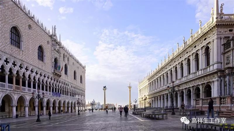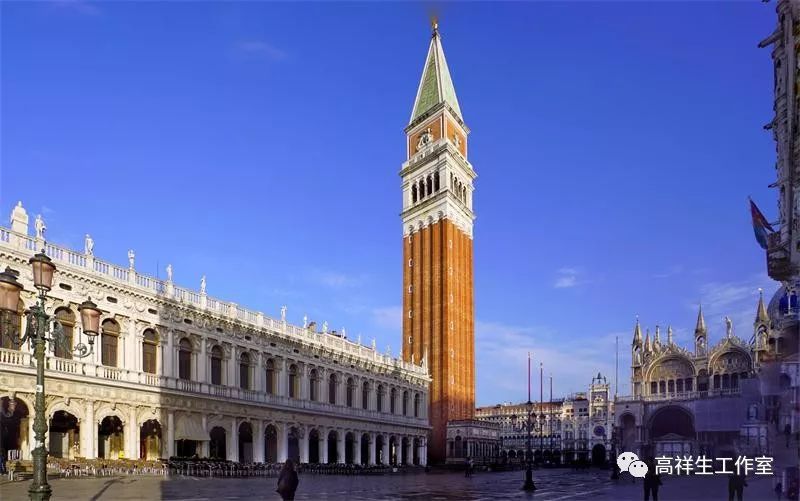 我在圣马可大小两广场转悠过多次,深感圣马可广场是开阔的、舒展的、富有韵味的……。但使我困惑的是:整体感很强的圣马可广场的空间是不同风格的建筑组成:大广场上圣马可教堂立面中既有显明哥特式建筑的垂直构建,又有拱起的拜占庭风格的穹顶和绘画,至于室内,其平面更是典型的基督教堂惯用的十字架平面。广场两侧的建筑,一边是较典型的古典建筑,另一边在古典建风格中渗透了巴洛克风格。两个广场的交叉处是一钟楼,它是大小两广场的制高点和视觉中心。钟楼原为海上航行的瞭望塔,现成为圣马可广场的标志性构筑物,高高耸立的灰红色调的钟楼是什么风格我不太清楚,但钟楼与两边的长廊,与圣马可教堂,与广场的整体环境无论从尺度上还是色彩上评价都很协调。