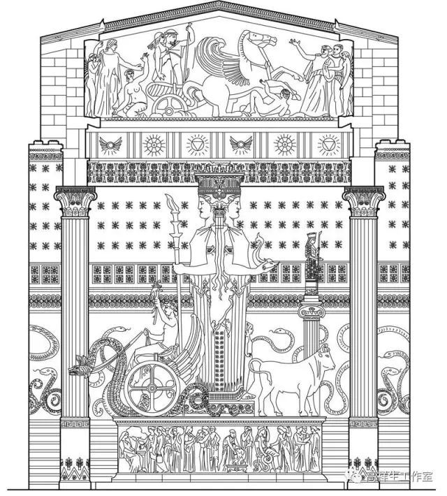 图1古希腊建造的多立克柱式。该图由高祥生工作室根据法国巴黎美术公司成立一百周年之际时该校师生测绘后复原的渲染图重新以CAD形式绘制