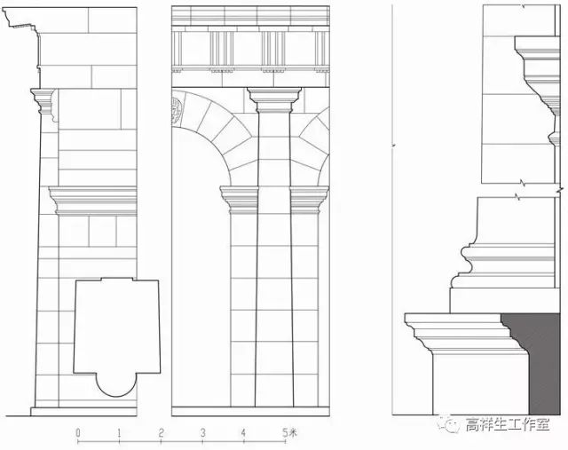 图36罗马法尔尼斯府邸券柱。该图由高祥生工作室根据法国巴黎美术公司成立一百周年之际时该校师生测绘后复原的渲染图重新以CAD形式绘制