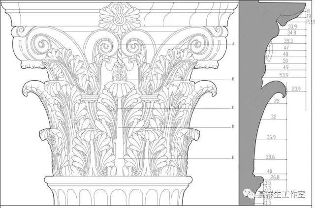图12古希腊建筑的科林新柱式。该图由高祥生工作室根据法国巴黎美术公司成立一百周年之际时该校师生测绘后复原的渲染图重新以CAD形式绘制