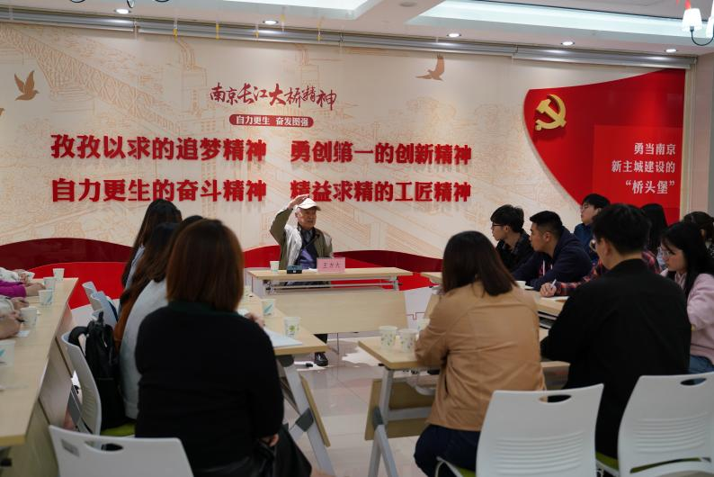 在大华社区党群服务中心,党员们有幸邀请到87岁高龄的老党员、曾任南京长江大桥建造工程师的王方大同志,听他讲述南京长江大桥建设相关的党史故事。王方大老人娓娓道来南京长江大桥的前世今生,一个个感人肺腑的奋斗故事将工人们当年建造大桥的艰辛和“自力更生、奋发图强”的大桥精神展现得淋漓尽致。党员们认真聆听桥史故事后纷纷表示,要从红色文化中汲取养分,继承革命精神,时刻不忘初心,坚定理想信念,在新时代展现新担当、新作为。