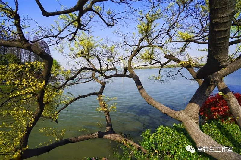 湖岸的空地上植满了观赏树,有成片的樱花,也有零星的梅花、桃花、杏花……岸边的凉亭、长廊中通常都有休闲的人们,有的在聊天、品茶,有的在棋盘上对弈,……亭边常有嬉闹的儿童和练气功、打太极的老人。