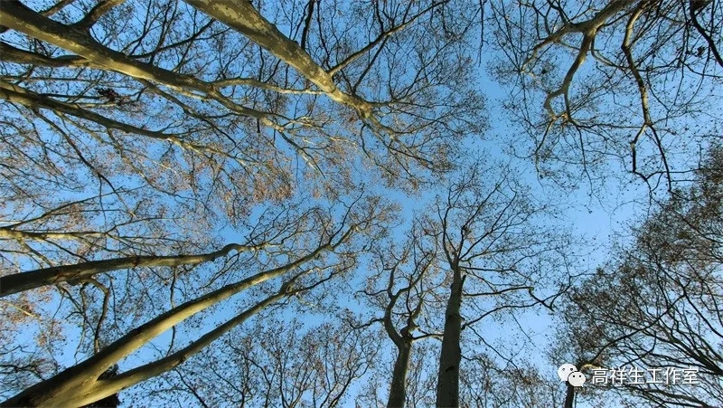 冬日,树叶凋零后的梧桐树,枝杆、树枝、树杈分明。树杆粗矮、敦实,树枝曲折、多变,树杈细密向上,有的还粘着枯萎的叶子,在蓝天下,这树杆、树枝、树杈风骨清朗、傲然挺立。在寒风中梧桐树显出饱经风霜的骨骼和柔情依在的情怀,此时它似乎还在诉说往日的风采。