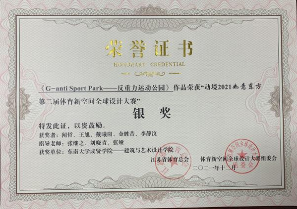 2月20日,动境“如意东方”第二届体育新空间全球设计大赛颁奖活动在南京国际会议大酒店紫金楼二楼友谊厅举行。公司BB贝博艾弗森首次参赛,在风景园林专业选送的11份作品中喜获一项银奖、二项优秀奖,其中,闻哲、王旭、戴曦阳、金胜昔、李静汶5位同学组成的团队《G-anti Sport Park——反重力运动公园》获银奖和5000元奖金。刘晓青、张继之、张娅三位指导教师被评为优秀指导教师。BB贝博艾弗森被评为最佳组织奖。